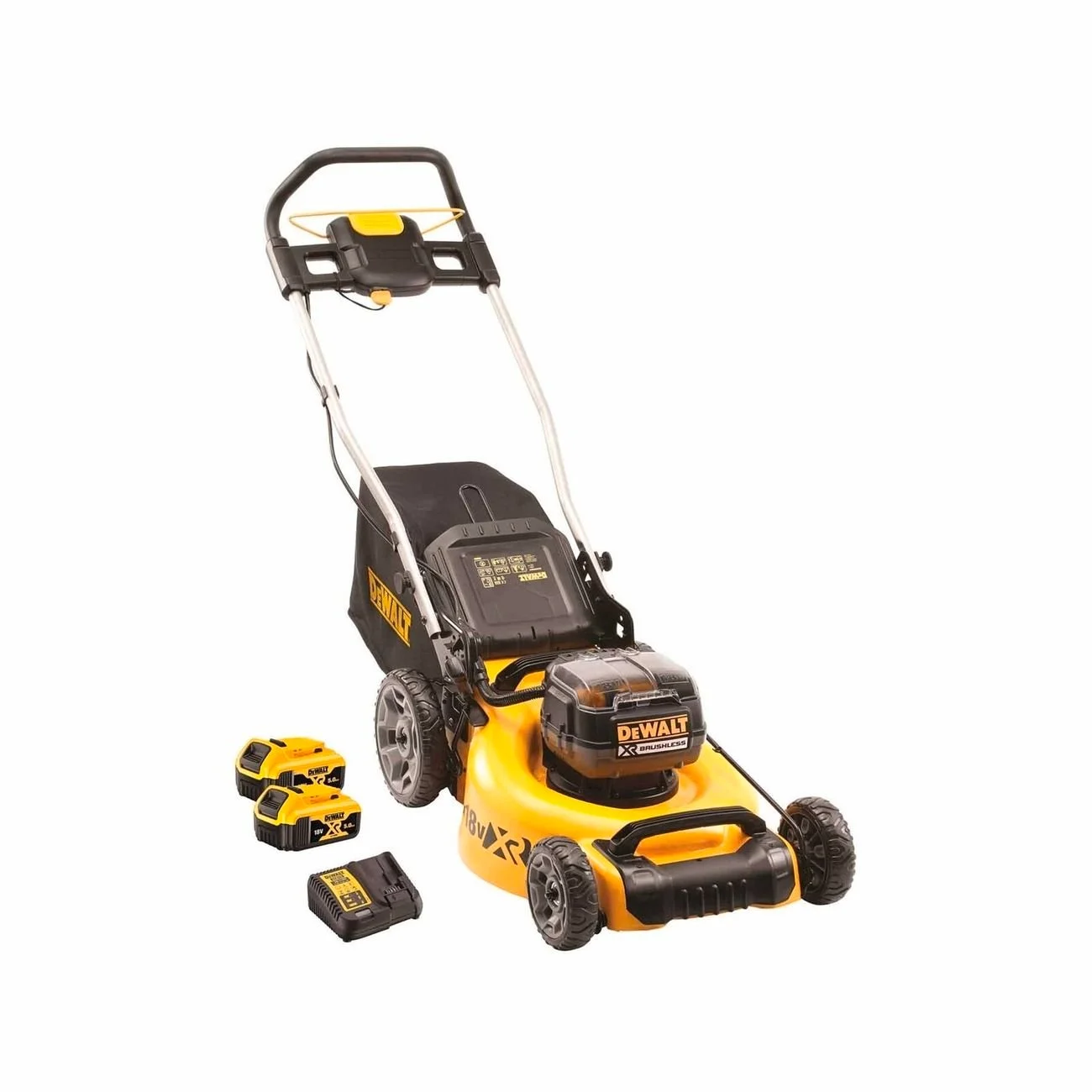 Dewalt 2 x 18V XR Li-Ion Lawn Mower 5Ah Kit (2 x 18V High Efficiency Brushless Motor with 36V Output, Cuts Up To 800m2 (Using 2 x DCB184), 51CM Metal Deck, 48CM Cutting Capacity, 5 Height Settings (25-86MM), 55L Collection Bag, Mulching Attachment, 2 x DEWALT 18V XR Battery Packs 5.0 Amp Hour, DCB115-XE XR Charger
