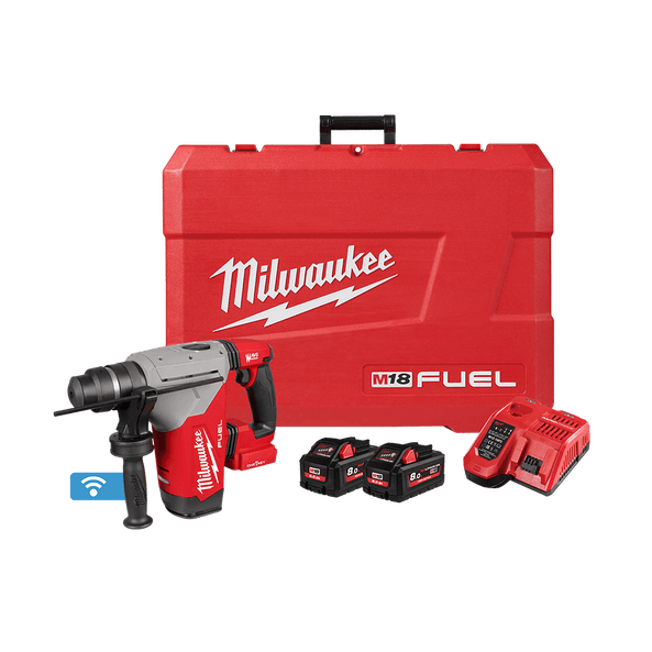 The M18 FUEL™ 28mm SDS Plus Rotary Hammer with ONE-KEY™ delivers fast drilling, hard hitting performance and maximum control for productivity on the jobsite. Designed to achieve top performance with only moderate pressure, the rotary hammer is compatible with all M18™ REDLITHIUM™ batteries, and is optimised for use with M18™ REDLITHIUM™ HIGH OUTPUT™ 8.0Ah batteries (sold separately). The POWERSTATE™ Brushless Motor delivers users 4.9 J of impact energy, 800 RPM, and 4,600 BPM, providing speed and power in the most demanding applications. REDLINK™ PLUS Intelligence tool technology ensures maximum rotary drill performance and protects the tool from overload, overheating, and over-discharge. The MILWAUKEE® M18 FUEL™ 28mm SDS Plus Rotary Hammer with ONE-KEY™ includes AUTOSTOP™ Kickback Control for maximum control and enhanced safety, with the tool sensing a bind-up situation when users are drilling in rebar or hard aggregate and stopping over-rotation, without the need for the user to release the trigger, indicated by the AUTOSTOP™ Indicator LED. The Anti-Vibration System (AVS) minimises vibration for maximum comfort when in use for extended periods. A Dedicated Dust Extractor (M18FDEX) is also available (sold separately), which once connected is powered by the Rotary Hammer. With ONE-KEY™ technology, users also gain the ability to customise, track and manage the tool.
