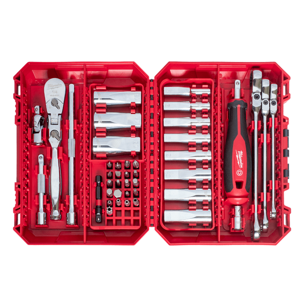 The MILWAUKEE 1/4″ Drive 42pc Premium Metric Socket, Bit & Wrench Set is designed offering our users the Most Versatile Sockets that are Anti-Roll and Wrench-Ready. Its innovative FOUR FLAT Sides feature an anti-roll and wrench-ready design. The 90 tooth ratchet tool offers 4° of arc swing and a slim profile design, allowing you to work in tighter and more confined spaces, be it under the hood of a car or in the middle of a remodel. All of our sockets are stamped with metric measurements on the flat side for easy-to-read visibility. It also comes with a durable carrying case for ultimate portability. Our Flex Head Ratcheting Combination Wrenches feature a market leading 2.5° of arc swing, and alongside the flex-head, allows our users to work quickly and efficiently tight spaces.The set comes with accessories included so that our users can get every job done, both in the garage and on the job site.