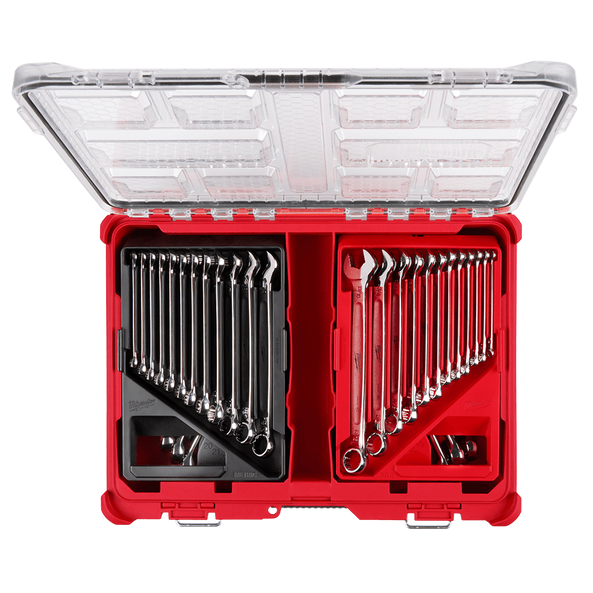 Our 30PC Metric & SAE Combination Wrench Set with PACKOUT™ Organiser includes combo wrenches that deliver up to 25% more torque. The MAX BITE™ Open-End Grip improves the wrench’s grip on nuts and bolts, and the geometry reduces rounding and stripping. The I-Beam handle design provides comfort in high torque applications and features easy-to-read ink-filled size labeling. All Milwaukee® Mechanics Hand Tools are backed by a Limited Lifetime Guarantee. The included PACKOUT™ Organiser is part of the Most Versatile Durable Modular Storage System. The Organiser is IP65-rated and built from impact-resistant materials for durability on and off the jobsite. All PACKOUT™ is backed by a Limited Lifetime Warranty.